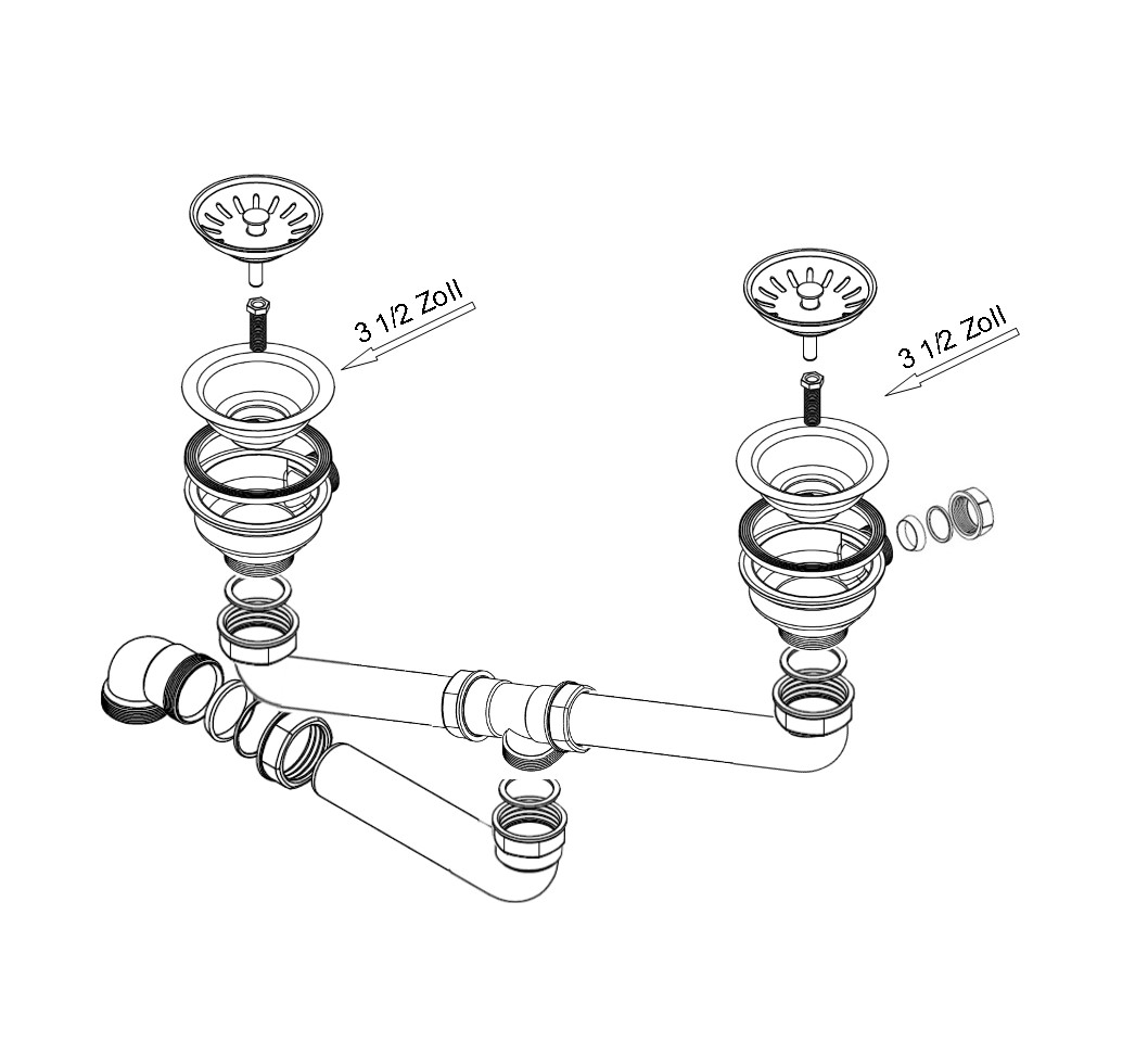 Der Überlauf kann wahlweise am einem der Korbventile angeschlossen werden. Diese Ablaufgarnitur ist geeignet für Spülen mit zwei gleich tiefen Becken.