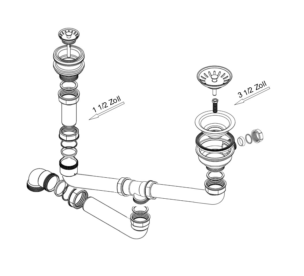 Der Überlauf kann wahlweise am einem der Korbventile angeschlossen werden. Diese Ablaufgarnitur ist geeignet für Spülen mit zwei unterschiedlich tiefen Becken.