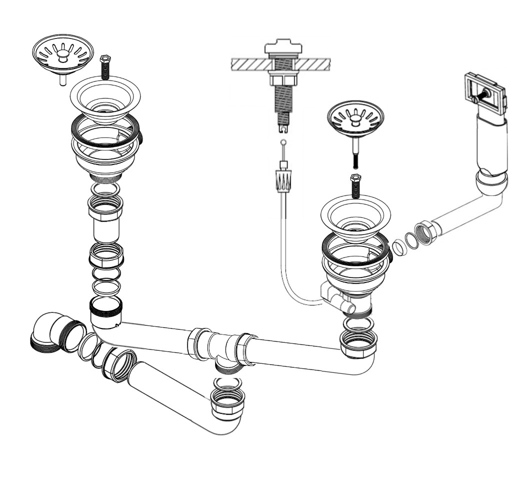 HPS-Ablaufverbindung 1½“ für Doppelspülen mit zentrischem Abgang, Höhenausgleichsstück und 1GA für Doppelspülen mit gleich tiefen Becken