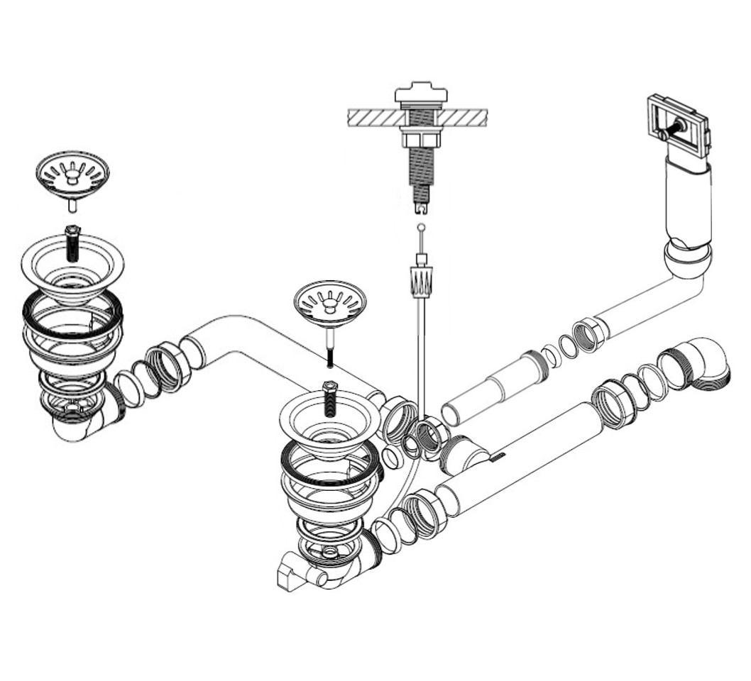 HPS-Ablaufverbindung 1½“ für Doppelspülen mit zentrischem Abgang, Höhenausgleichsstück und 1GA für Doppelspülen mit gleich tiefen Becken