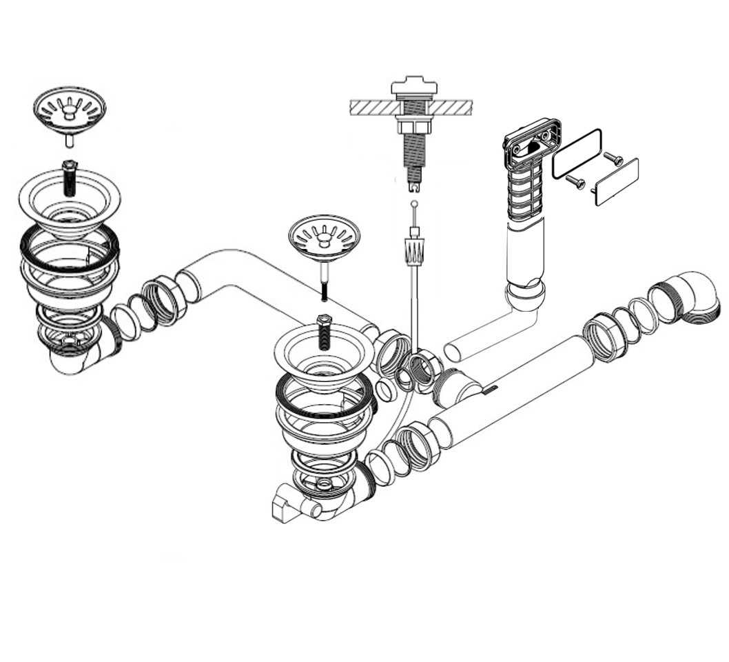 HPS-Ablaufverbindung 1½“ für Doppelspülen mit zentrischem Abgang, Höhenausgleichsstück und 1GA für Doppelspülen mit gleich tiefen Becken