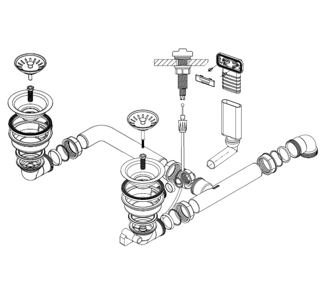 HPS-Ablaufverbindung 1½“ für Doppelspülen mit zentrischem Abgang, Höhenausgleichsstück und 1GA für Doppelspülen mit gleich tiefen Becken