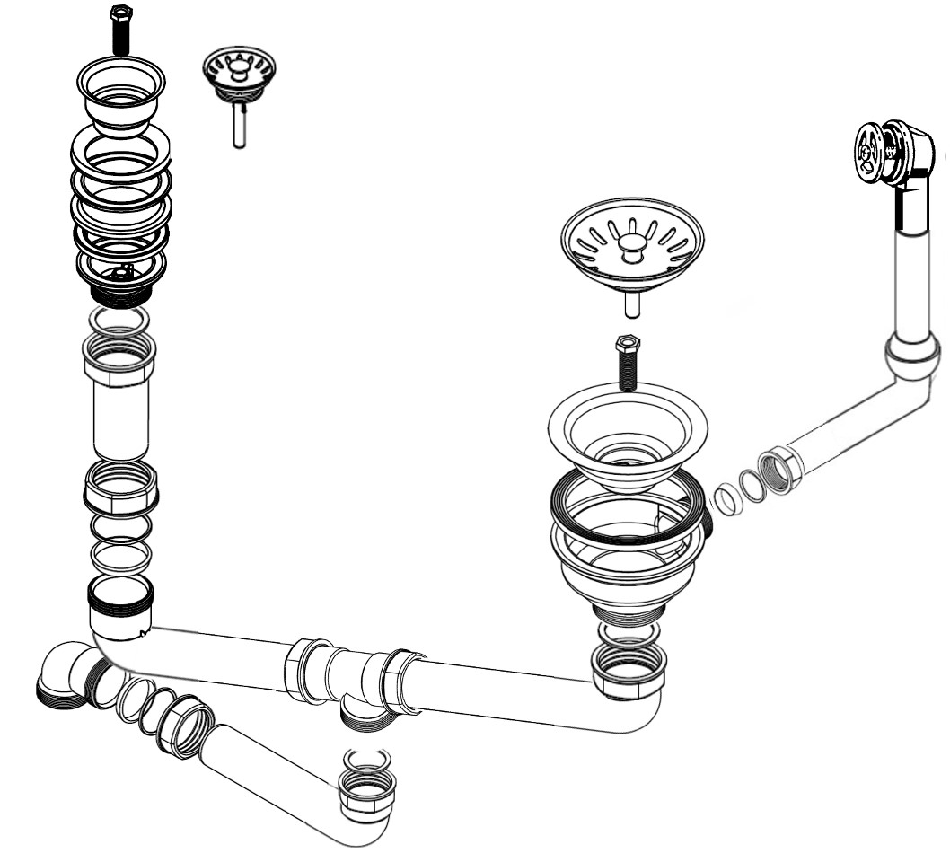 HPS-Ablaufverbindung 1½“ für Doppelspülen mit zentrischem Abgang, Höhenausgleichsstück und 1GA für Doppelspülen mit gleich tiefen Becken