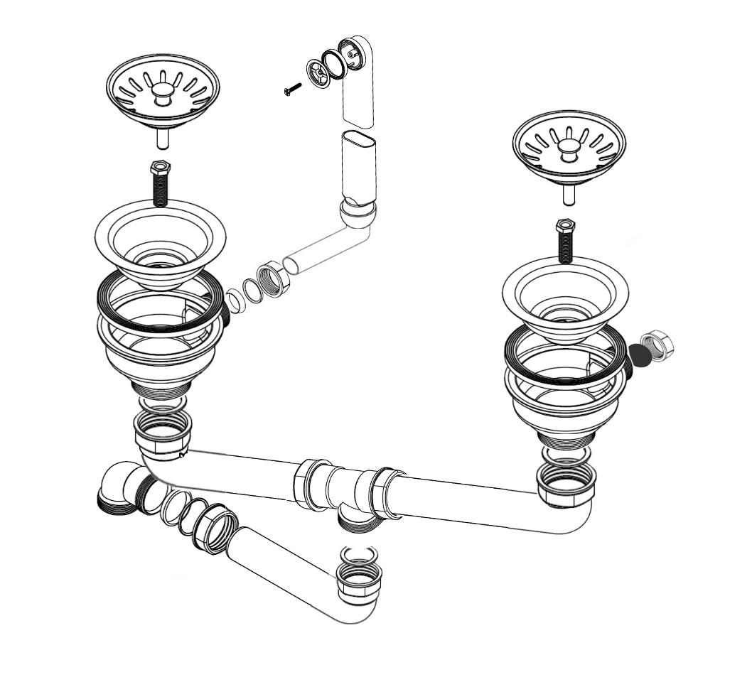 HPS-Ablaufverbindung 1½“ für Doppelspülen mit zentrischem Abgang, Höhenausgleichsstück und 1GA für Doppelspülen mit gleich tiefen Becken