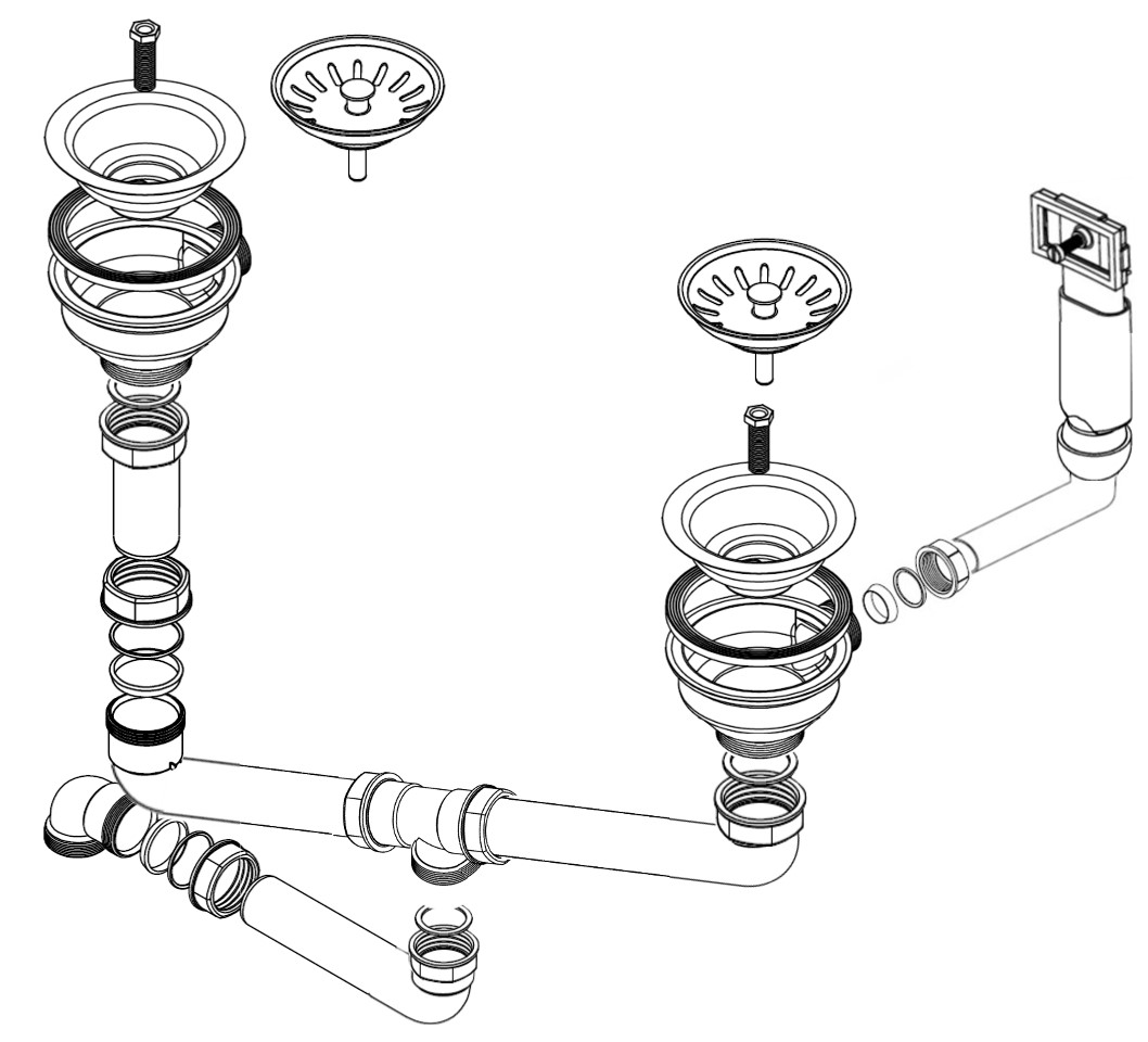 HPS-Ablaufverbindung 1½“ für Doppelspülen mit zentrischem Abgang, Höhenausgleichsstück und 1GA für Doppelspülen mit gleich tiefen Becken