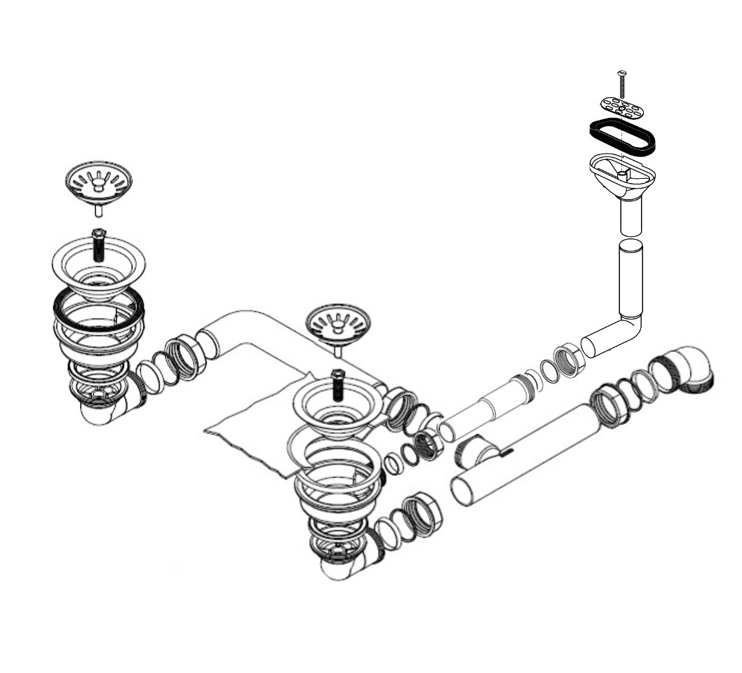 HPS-Ablaufverbindung 1½“ für Doppelspülen mit zentrischem Abgang, Höhenausgleichsstück und 1GA für Doppelspülen mit gleich tiefen Becken