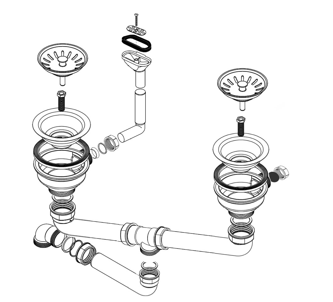 HPS-Ablaufverbindung 1½“ für Doppelspülen mit zentrischem Abgang, Höhenausgleichsstück und 1GA für Doppelspülen mit gleich tiefen Becken