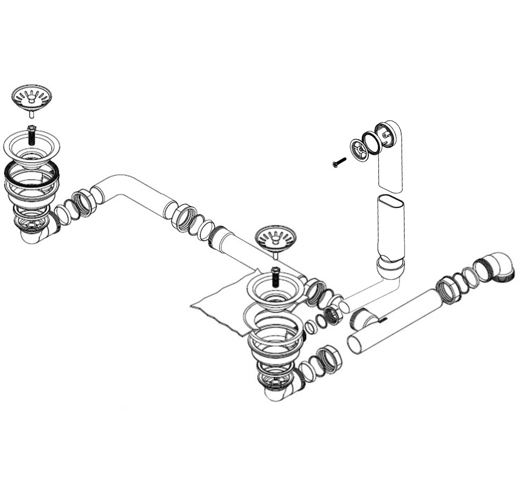 HPS-Ablaufverbindung 1½“ für Doppelspülen mit zentrischem Abgang, Höhenausgleichsstück und 1GA für Doppelspülen mit gleich tiefen Becken