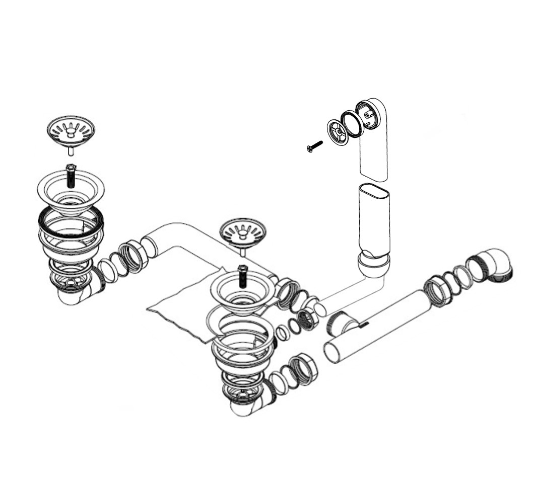 HPS-Ablaufverbindung 1½“ für Doppelspülen mit zentrischem Abgang, Höhenausgleichsstück und 1GA für Doppelspülen mit gleich tiefen Becken