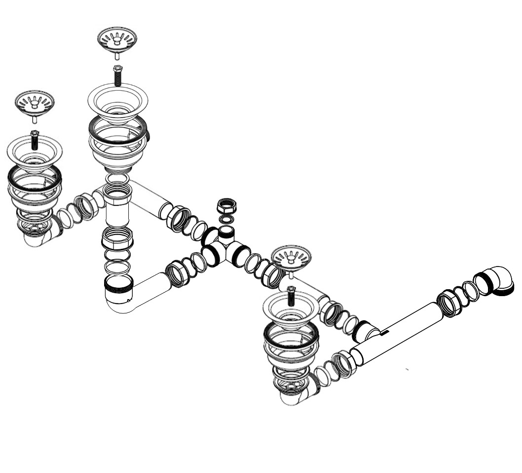HPS-Ablaufverbindung 1½“ für Doppelspülen mit zentrischem Abgang, Höhenausgleichsstück und 1GA für Doppelspülen mit gleich tiefen Becken