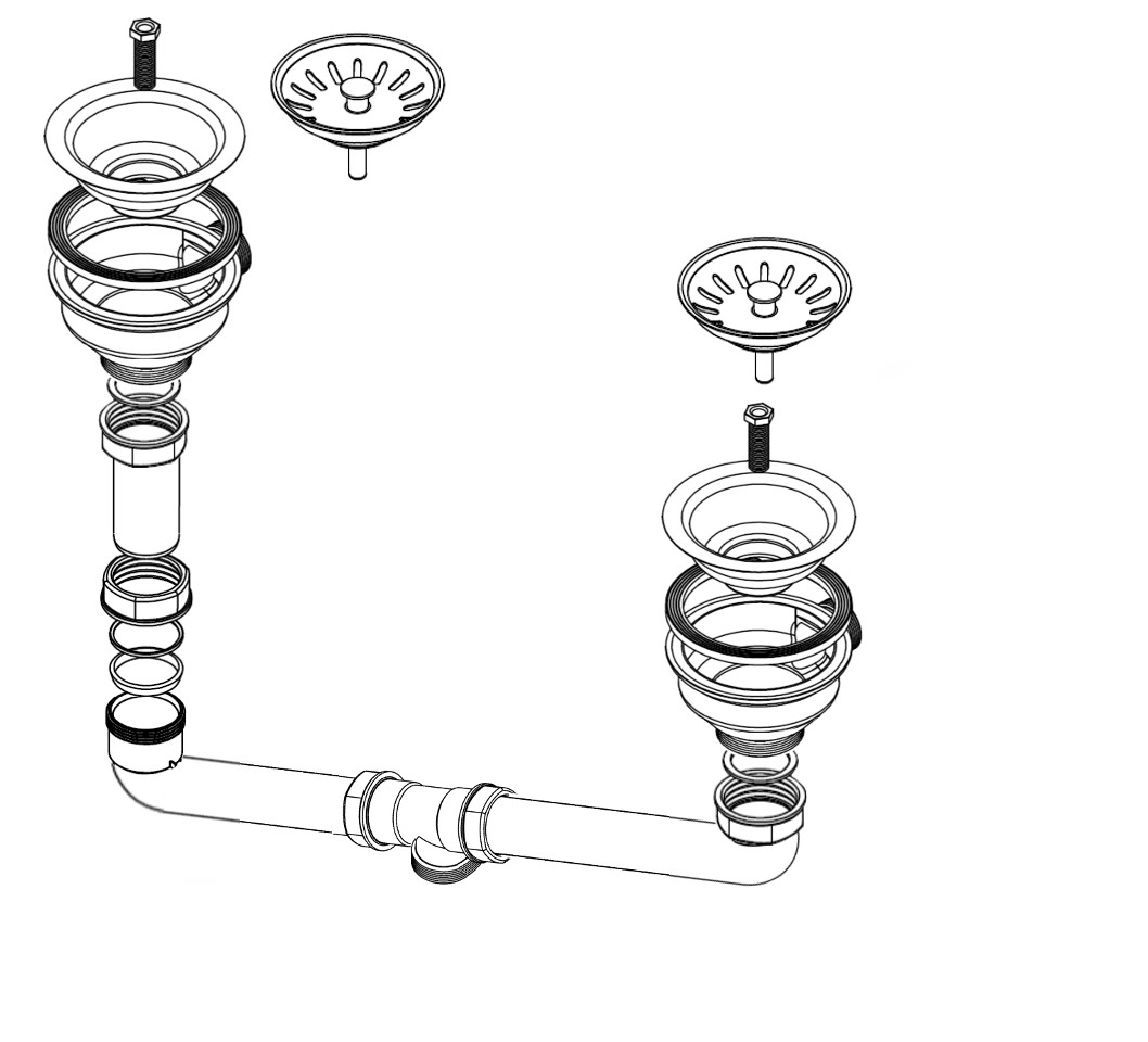 HPS-Ablaufverbindung 1½“ für Doppelspülen mit zentrischem Abgang, Höhenausgleichsstück und 1GA für Doppelspülen mit gleich tiefen Becken