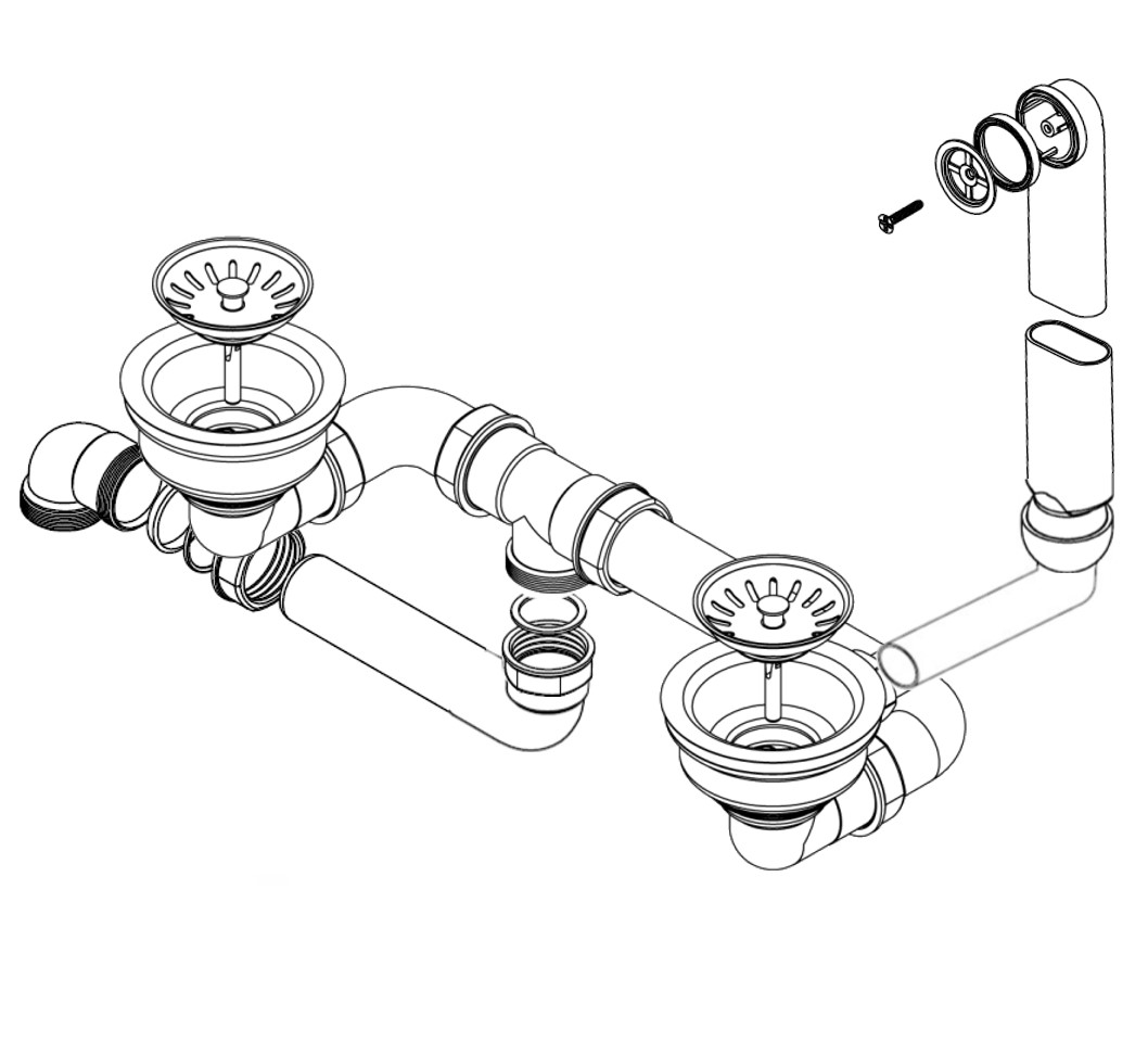 HPS-Ablaufverbindung 1½“ für Doppelspülen mit zentrischem Abgang, Höhenausgleichsstück und 1GA für Doppelspülen mit gleich tiefen Becken