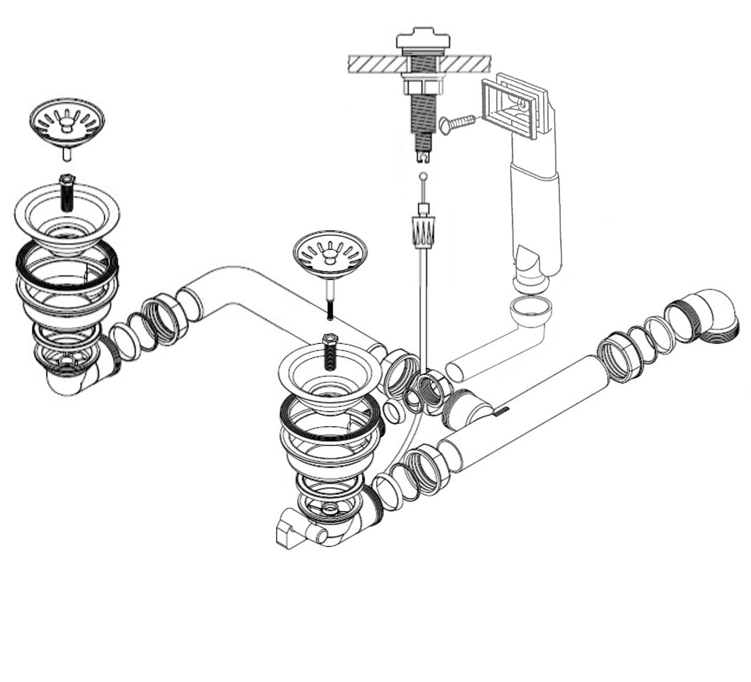 HPS-Ablaufverbindung 1½“ für Doppelspülen mit zentrischem Abgang, Höhenausgleichsstück und 1GA für Doppelspülen mit gleich tiefen Becken