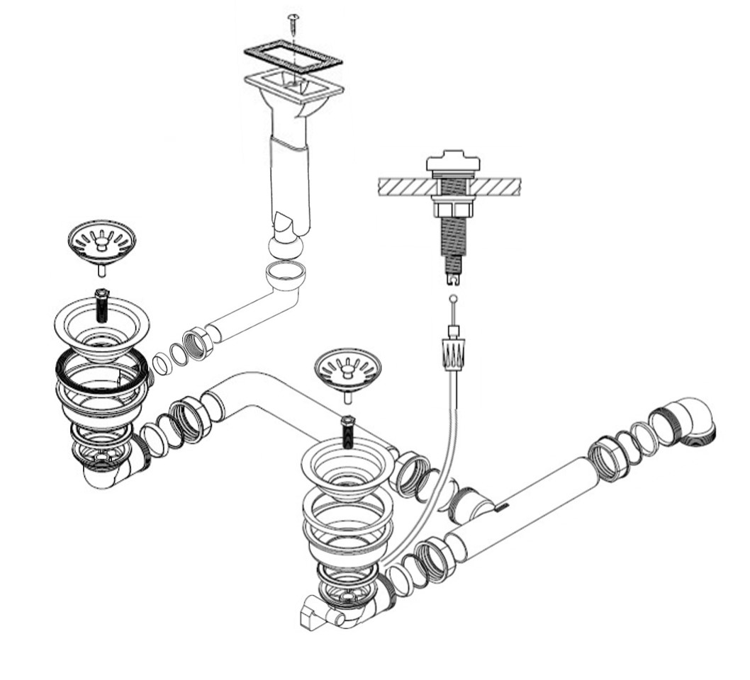 HPS-Ablaufverbindung 1½“ für Doppelspülen mit zentrischem Abgang, Höhenausgleichsstück und 1GA für Doppelspülen mit gleich tiefen Becken