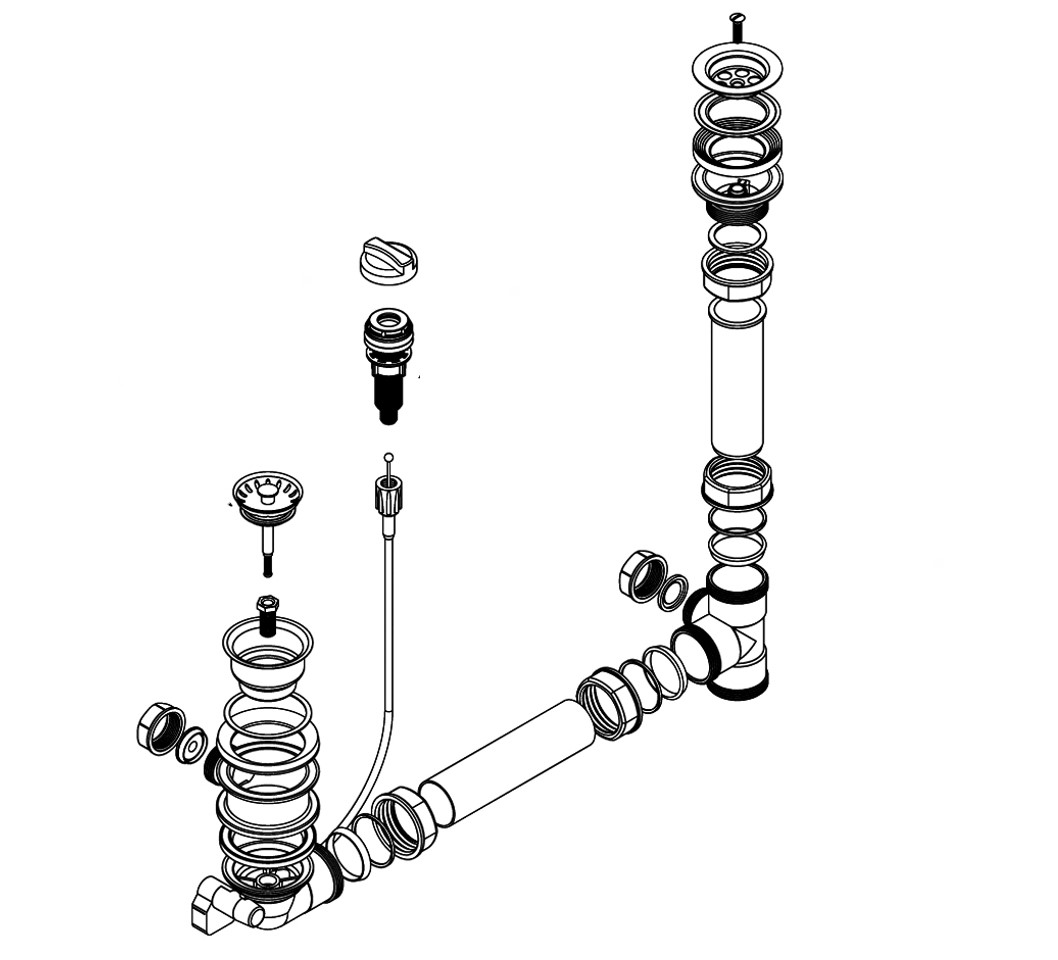 HPS-Ablaufverbindung 1½“ für Doppelspülen mit zentrischem Abgang, Höhenausgleichsstück und 1GA für Doppelspülen mit gleich tiefen Becken
