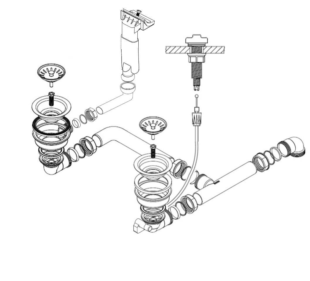 HPS-Ablaufverbindung 1½“ für Doppelspülen mit zentrischem Abgang, Höhenausgleichsstück und 1GA für Doppelspülen mit gleich tiefen Becken
