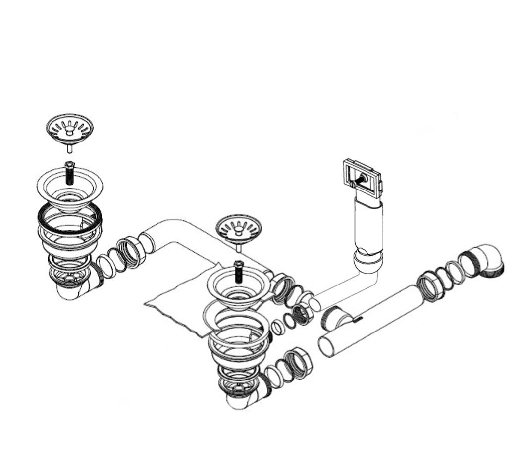 HPS-Ablaufverbindung 1½“ für Doppelspülen mit zentrischem Abgang, Höhenausgleichsstück und 1GA für Doppelspülen mit gleich tiefen Becken