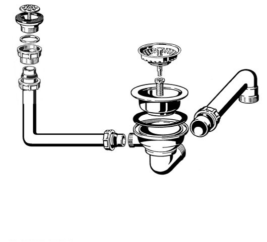 HPS-Ablaufverbindung 1½“ für Doppelspülen mit zentrischem Abgang, Höhenausgleichsstück und 1GA für Doppelspülen mit gleich tiefen Becken