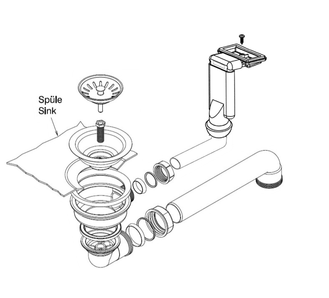 HPS-Ablaufverbindung 1½“ für Doppelspülen mit zentrischem Abgang, Höhenausgleichsstück und 1GA für Doppelspülen mit gleich tiefen Becken