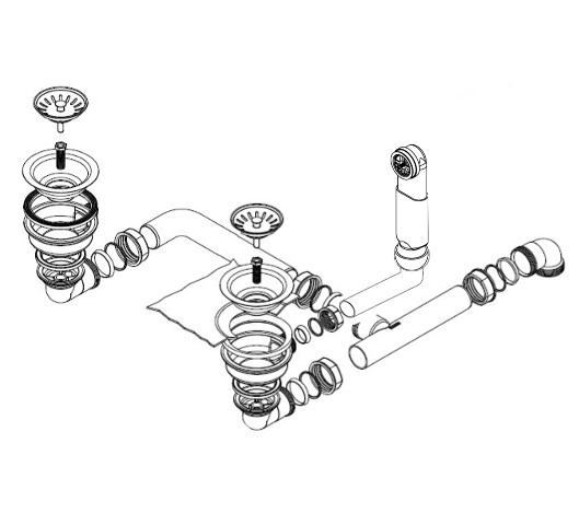 HPS-Ablaufverbindung 1½“ für Doppelspülen mit zentrischem Abgang, Höhenausgleichsstück und 1GA für Doppelspülen mit gleich tiefen Becken