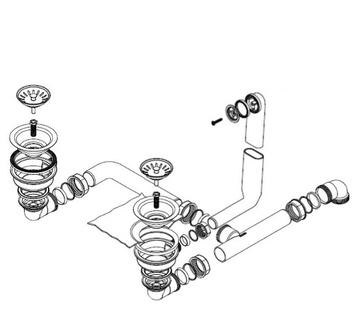 HPS-Ablaufverbindung 1½“ für Doppelspülen mit zentrischem Abgang, Höhenausgleichsstück und 1GA für Doppelspülen mit gleich tiefen Becken