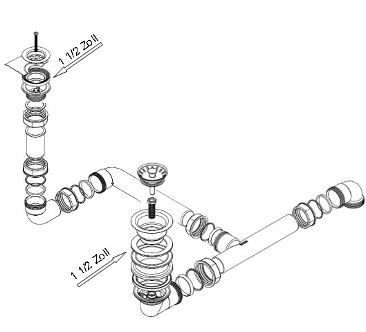 HPS-Ablaufverbindung 1½“ für Doppelspülen mit zentrischem Abgang, Höhenausgleichsstück und 1GA für Doppelspülen mit gleich tiefen Becken