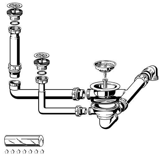 HPS-Ablaufverbindung 1½“ für Doppelspülen mit zentrischem Abgang, Höhenausgleichsstück und 1GA für Doppelspülen mit gleich tiefen Becken